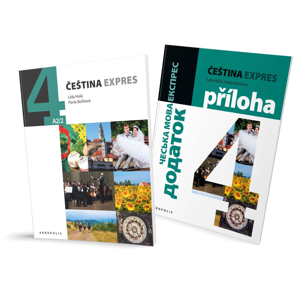 Комплект «Чеська мова експрес 4» складається з підручника та робочого зошита (лише чеською мовою), аудіозаписів текстів і Додатка з граматичними таблицями та поясненнями у трьох мовних версіях. Додаток, крім того, містить ключ до вправ, а також посторінковий та алфавітний словничок. Книгу для вчителя та аудіозаписи можна завантажити безкоштовно.